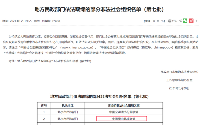 记者调查发现,学员们获得的跆拳道等级证书的颁发机构“中国泰山北斗联盟”,是一个非法社会组织。2021年8月20日,民政部公布该非法社会组织已被依法取缔。
