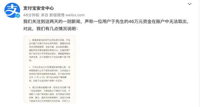 “男子46万元被冻结”?支付宝回应了