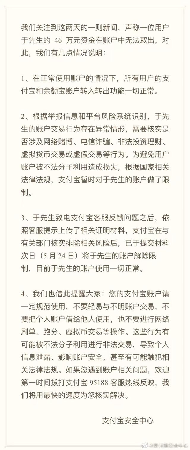 6月22日,支付宝安全中心回应表示,根据举报信息和平台风险系统识别,于先生的账户交易行为存在异常情形,可能涉及网络赌博、电信诈骗、非法投资理财或是虚假交易等违规情形。为避免用户账户被不法分子利用造成损失,根据国家相关法律法规,支付宝当时对于先生的账户做了一定限制。支付宝客服和于先生核实排除风险后,其账户早已于5月恢复正常使用。