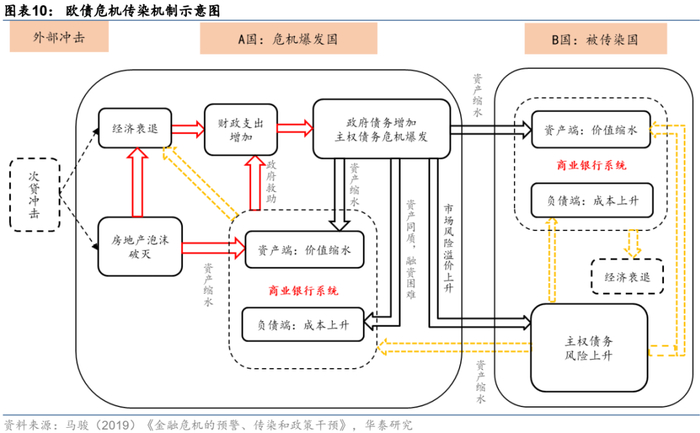 影响:欧元区国家银行体系互相持有政府国债,使得经济背景相对较差的次主要国家意大利、西班牙等国的银行体系也遭受了资产减值损失,阻碍实体经济信贷扩张,经济开始陷入衰退,财政体系不堪重负,也逐渐被传染。随着欧猪五国的债券收益率上行,欧洲各大银行持有的大量债务国国债价格大幅下跌、违约风险上升,银行业资产负债表受到感染。欧洲银行通常以所持有的债券,向央行借贷或开展同业拆借,欧猪五国的债券收益率上行直接推高银行的融资成本。与此同时,欧洲多国政府陷入财政危机,向银行提供担保的能力不断降低,银行评级受到影响。