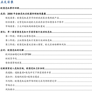 2009年12月,希腊债务危机率先爆发,三大评级机构先后下调其主权债务评级,随后危机蔓延到银行业和其他有债务隐患的国家,造成欧洲主权债务危机。欧债危机的成因有制度、经济和市场三方面的因素。制度方面,欧元区货币和财政政策分离的二元结构导致政策协调的矛盾。经济方面,美国次贷危机波及全球市场,欧元区部分国家通过财政支出化解危机,恶化了财政情况。市场方面,三大评级机构下调希腊主权评级进一步助推危机蔓延。