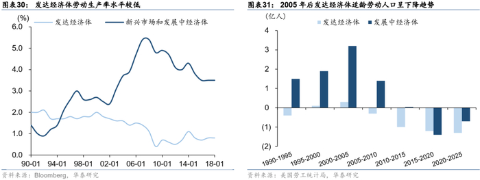 人口老龄化和高福利导致政府赤字不断扩张,发达经济体劳动生产率和适龄人口较低抑制长期经济增长动能。从经济增长潜力看,发达经济体劳动生产率增速在2000-2008年显著下降,而新兴市场和发展中经济体的劳动生产率增速在金融危机前大幅提高。从适龄劳动人口占总人口比重来看,2005年之后,发达经济体适龄劳动人口占比便已经开始下降。适龄劳动力人口占比的降低,虽然不直接影响劳动生产率增速,但是会降低经济增长动能,阻碍长期经济增长潜力。