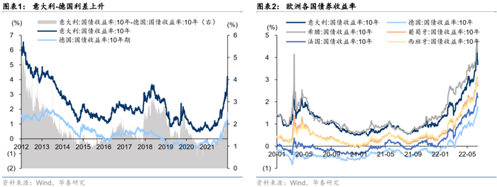 欧央行在必要时也会采取措施,6月议息会议后表示设计新方案应对市场波动,我们认为大概率会调整已有工具包,降低欧元区债务割裂的风险:(1)或启用2012年设计的直货币交易计划(OMT),允许欧央行无限制地在二级市场购买一个国家的债务,以定向缓解部分国家主权债务的恐慌性抛售风险。OMT购债实施需要满足一定条件,包括成员国需满足申请EFSF/ESM在一级市场购债的条件;(2)可能考虑重新启用资产购买计划,比如灵活调整紧急抗疫购债计划(PEPP)、重启PSPP计划、进行收益率曲线控制等。欧央行6月15日紧急会议中表示将灵活运用PEPP计划中即将到期的资金进行再投资,以保持货币政策传导机制的运作。