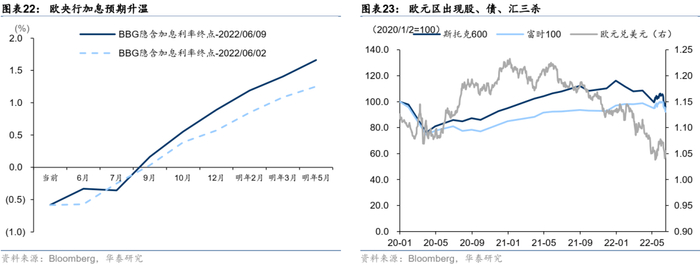 回到2022年,欧元区目前面临高通胀+高杠杆+不均衡的三重压力,防止再次爆发主权债务风险可能是欧央行政策的底线。欧洲央行在2022年6月份公布最新的货币政策,加息预期之后,出现了股、汇、债三杀的局面。欧股、美股均收跌,德国10年期国债收益率日内上行幅度超过10bp,意大利10年期国债收益率日内上行20bp。但欧元区国债收益率曲线小幅平坦化、欧元日内贬值,说明市场交易的逻辑主要在于欧元区紧缩预期升温后的衰退担忧和对全球经济的拖累。短期内,欧央行的加息预期或仍有进一步走高的空间。