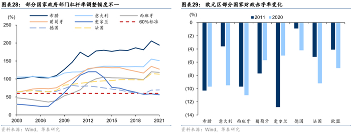 09年欧债危机爆发之后,欧元区国家对杠杆率和财政赤字进行了积极的调整,使得欧元区内债务风险有所降低,但不同国家的调整幅度不一。新冠疫情冲击后各国赤字率仍处于较高水平,爱尔兰、葡萄牙财政赤字率均出现显著降低,而主导国家中,西班牙、意大利、法国的财政赤字不降反升,政府部门杠杆率在欧债危机后仍有所上升,而德国的财政赤字在2011年便很小,经过多年的财政收缩后到了2018年的1.9%的财政盈余,政府杠杆率也有显著的下降,但2020年因新冠疫情冲击财政赤字率与政府部门杠杆率均有所回升。