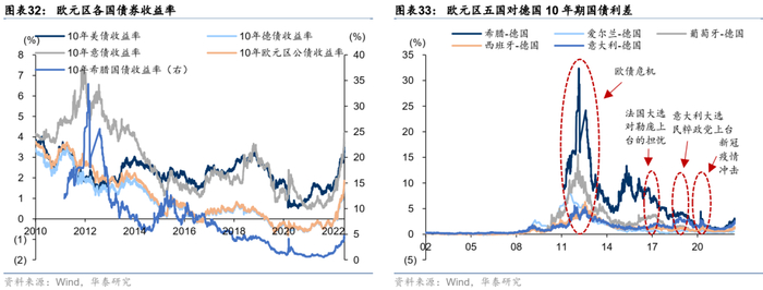 加息影响分化背景下国债利差走阔。由于各国周期存在一定程度上的错位,因而加息对各国的影响不同。对于部分处于经济增长周期的国家来说,加息是牺牲了部分增长来抑制通胀,而对于一部分处在经济下行周期的国家来说,加息进一步抑制消费从而加速经济萎靡并扩大债务。这种分化将导致资本市场上国债收益率差距走阔。欧央行迟来的应对通胀措施或导致收水过快而引发泡沫破裂。此外,国债利差的走阔往往也暗示了“欧元区”解体的极端预期。