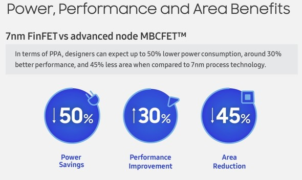 根据三星的报道,和自家的7nm 工艺相比,自家 GAA 的初始版本 3GAE ( 3nm Gate-All _ Around Early )可以减少 35% 的芯片面积,提高 30% 的性能,降低 50% 的功耗。
