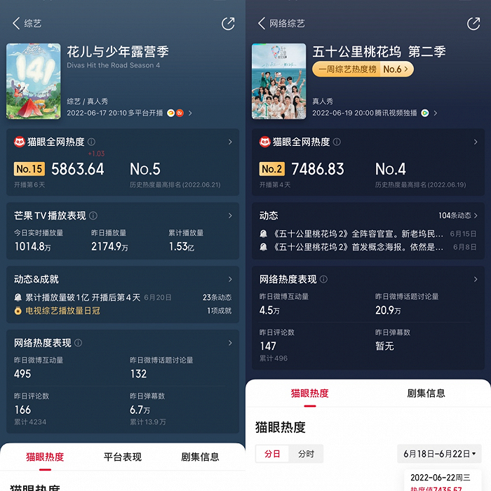 虽然目前来看,《桃花坞2》的话题热度尚未完全发酵:猫眼、灯塔等数据平台上,节目热度值尚未进入top3。但若横向来比,相比同期开播的《花少》露营季,“坞学”已然实现了热度突破。