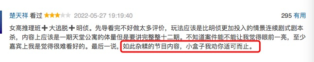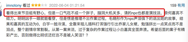 “一口气吃不成大胖子”、虽然客观上后明侦时代市场仍未催生一档新爆款,但腾讯视频携手何忱全力加码的《开始推理吧》,仍备受市场期待,只是播出后却出现了以上高赞短评。