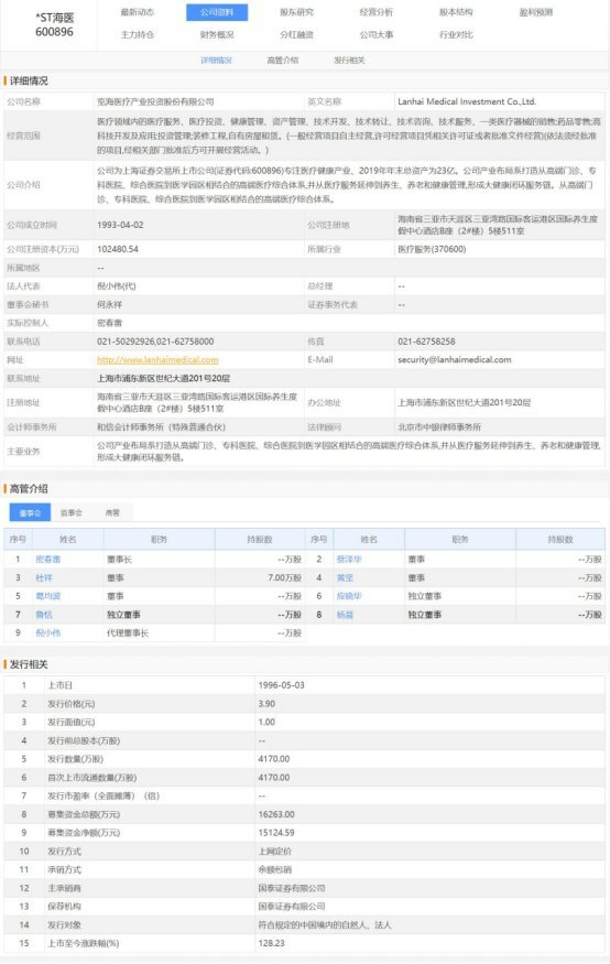 据公开资料显示,*ST海医主要从事高端医疗项目的投资建设及运营管理。公司前身正是前文所提的中海海盛,2015年密春雷斥资30亿元成为公司实控人。