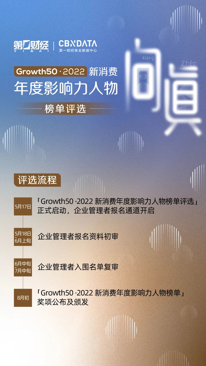 在此背景下,第一财经、CBNData(第一财经商业数据中心)首度发起「Growth50·2022新消费年度影响力人物榜单评选」,最终奖项入围名单将与《2022中国新消费品牌Growth50榜单》(总榜及各分榜)、《2022中国新消费品牌增长力白皮书》等重磅内容,同步于8月初在上海举办的新消费品牌增长峰会现场正式公布。