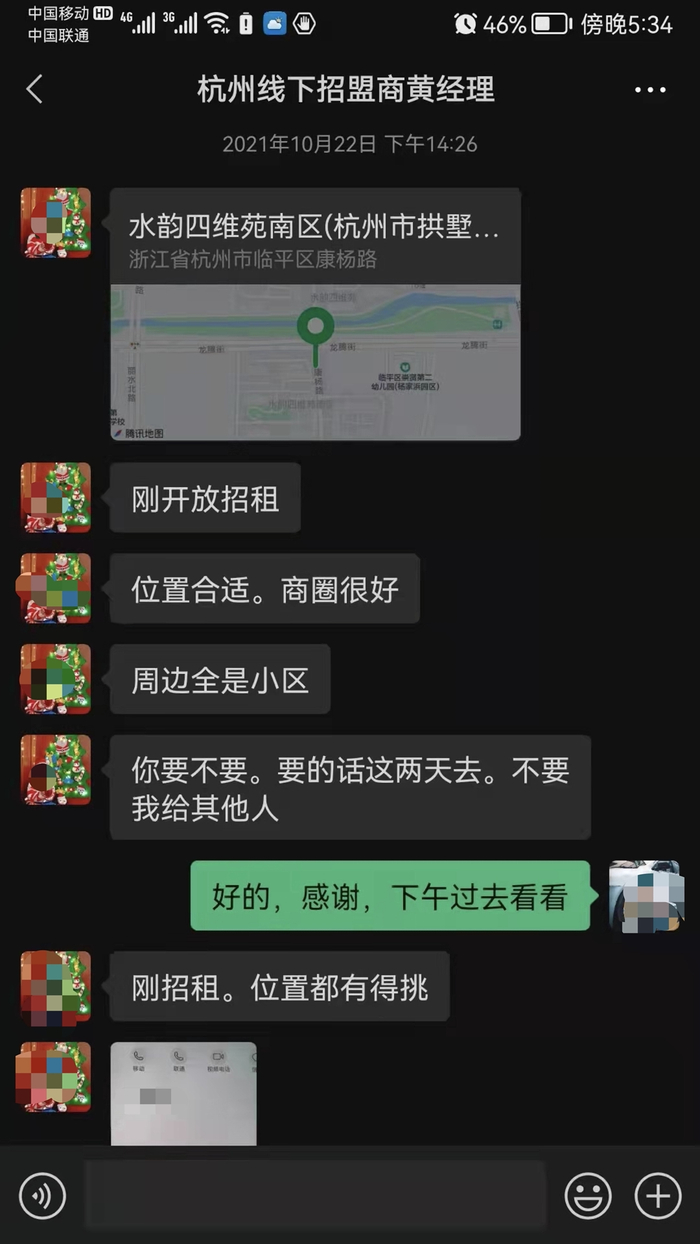 胡先生说,在多个场地被黄文涛否定后,2021年10月20日,黄文涛向他主动推荐了一个位于杭州崇贤街道龙腾街的商铺,称地段数据非常好,并且符合途虎加盟店的开设要求,建议胡先生把店铺选址定在他推荐的场地,“他说这个场地他有一手资料,比其他地方都要好,以各种夸大的方式让我相信,并且直接给了物业的电话,让我直接联系物业。”