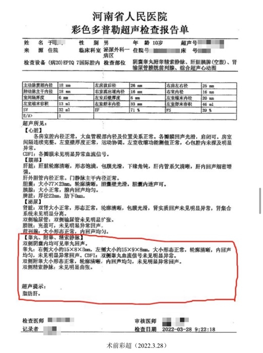 在接受第二次手术后,彩超报告显示其“右侧精索未见明显肿胀,左侧精索周围软组织肿胀,可见条片状低回声区”“右侧精索未见明显肿胀。左侧睾丸未见明显血流信号”。