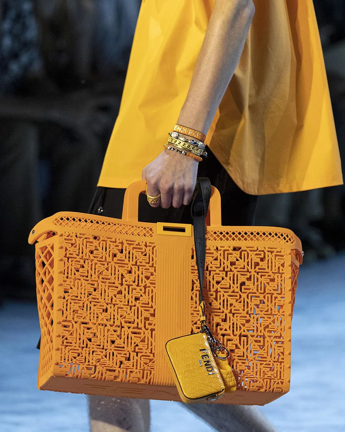 Fendi 2023春夏男装秀款包袋系列中融合环保理念,前卫而符合当下时尚行业的品牌责任感。Fendi大号镂空X-Tote包袋利用再生塑料而制,增添橙色,深蓝色以及米白色夏日亮色,并加载实用的大容量设计,适合作为假日海边沙滩包使用,随时随刻精致随行。