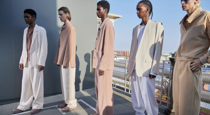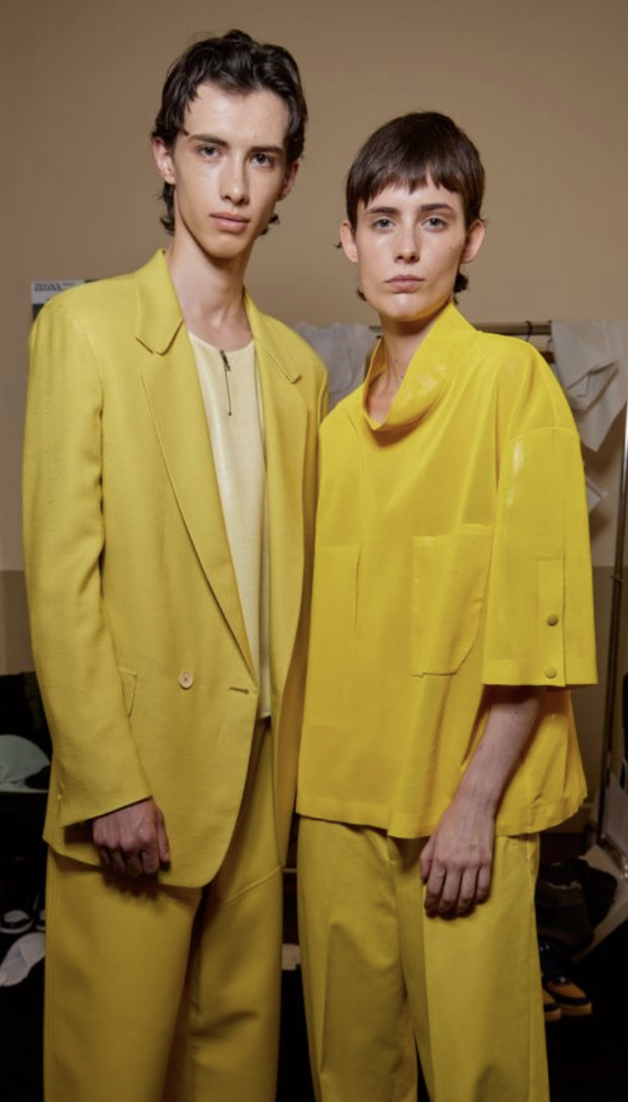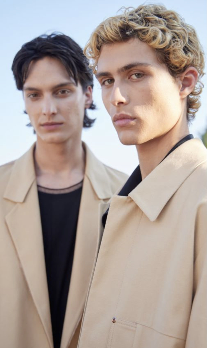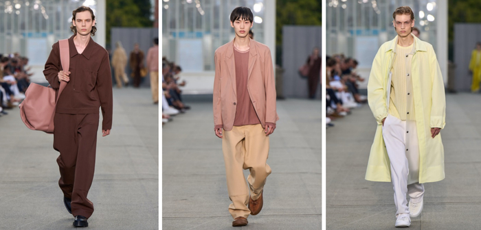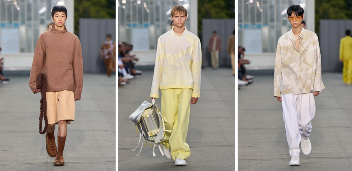 传统的内外界限被大胆颠覆,这很大程度上归功于针织衫的可塑性。网纱经由不断的技术研发被巧妙转变为织物,打造出技术含量高且格外轻巧的全新服饰类别。通透的设计更突显出轻盈感。毛圈棉织物被剪裁成以衬衫夹克搭配休闲长裤的套装,采用单色配色或同色系叠搭,造型流畅随性。