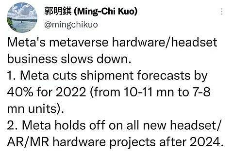 就在6月22日,天风国际分析师郭明錤称,Meta推迟了2024年之后所有新耳机、AR、MR硬件项目,并将2022年的出货量预测下调40%。
