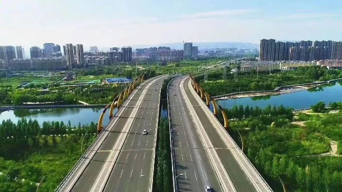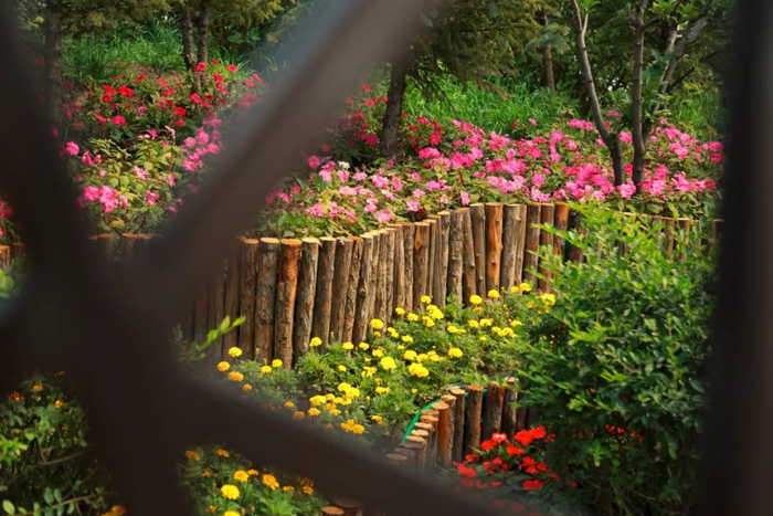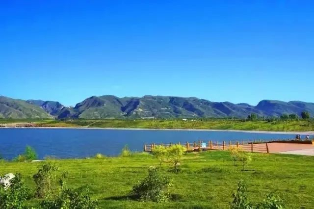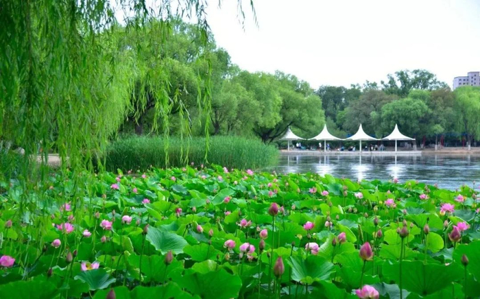 岸边凉亭水榭,绿柳成荫,碧水青山相映