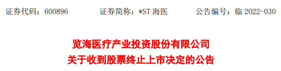 6月21日,*ST海医发布公告称,公司收到上海证券交易所《关于览海医疗产业投资股份有限公司股票终止上市的决定》,上海证券交易所决定终止公司股票上市。公司股票将自6月28日进入退市整理期,预计最后的交易日期为7月18日。