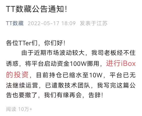 但5月以来,多个数字藏品平台产品交易价格出现暴涨暴跌现象,其中iBox平台因数字藏品价格腰斩,一度冲上微博热搜前十。“TT数藏”平台则因平台无法继续运营,宣告倒闭。同时,多家数字藏品平台陷入破产、跑路传闻。