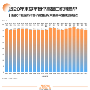 2022年,山东省首个高温日为4月11日,出现在寿光(最高气温35.4℃),是近20年来最早的一年,比去年的5月27日足足提前了46天。