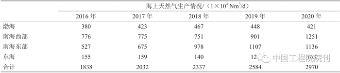 煤炭、石油、天然气等一次能源消费量随着经济社会发展而快速增长,这是全球性趋势。天然气在我国国家能源战略中起着关键作用,近十年天然气消费量及对外依存度均快速增长,2018 年我国天然气对外依存度已达 45.3%,逼近 2035 年天然气对外依存度为 50% 的上限。加快实现我国自有天然气资源的开发利用已刻不容缓。我国海域面积约为 3×106 km2 ,蕴藏着较为丰富的油气资源,如我国海上天然气地质资源量约为 4.25×1013 m3 (近海约为 1.07×1013 m3 )。在我国主张管辖的南海范围内,油气资源储量同样十分可观,是国内天然气资源最为丰富的地区和生产来源;天然气地质资源量约为 1.6×1013 m3 ,约占我国油气总资源量的 1/3、全世界的 12%;作为世界四大油气资源富集海域之一,一直是我国海上天然气勘探开发的主要区域。根据中国海洋石油有限公司 2020 年年报,给出了近年来我国海上天然气生产情况(见表 1)。