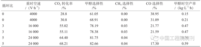 海洋石油富岛化学公司、中国科学院上海高等研究院合作开展富碳天然气制甲醇一体化方面的小试、中试研究及工业示范:掌握反应过程中 CO2 吸附活化、H2 解离催化剂双功能活性位原理,利用结构限域来制备高活性、高稳定性、纳米化的铜基复合催化剂;在反应温度为 230~250 ℃、压力为 5 MPa 的条件下,CO2 单程转化率超过 28.8%,甲醇选择性大于 61.05%;在尾气循环条件下,CO2 转化率超过 55.02%;在完成近 5000 h 连续运转的基础上,获得了千克级催化剂放大及单管规模的试验验证结果(见表 3)。