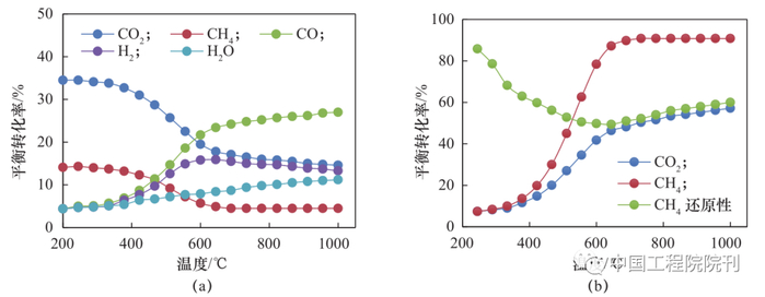 在上述理想化的反应过程中,CH4 的 MRC=3,即1 个 CH4 分子可以还原 3 个 CO2 分子,这表明类似南海富碳天然气中的 CO2 可以直接转化为 CO 的极限值为 75%;但反应受热力学限制而难以直接发生。图 1 展示了原料气中 CO2/CH4 比例为 3.3 时,不同温度条件下热力学平衡状态的气体组成、CH4 和 CO2 平衡转化率、CH4 还原性。