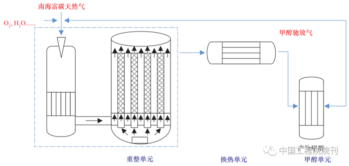 富碳天然气制甲醇一体化指将富碳天然气直接多重整(干重整、普通重整、氧化重整等的复合)转化为高氢碳比合成气(H2/(CO+CO2)>2),耦合性能优异的合成甲醇催化剂(如纳米化铜基复合催化剂)直接合成甲醇。相关技术是富碳天然气高效减排与利用的重要解决方案,而传统的天然气制甲醇技术无法直接采用。