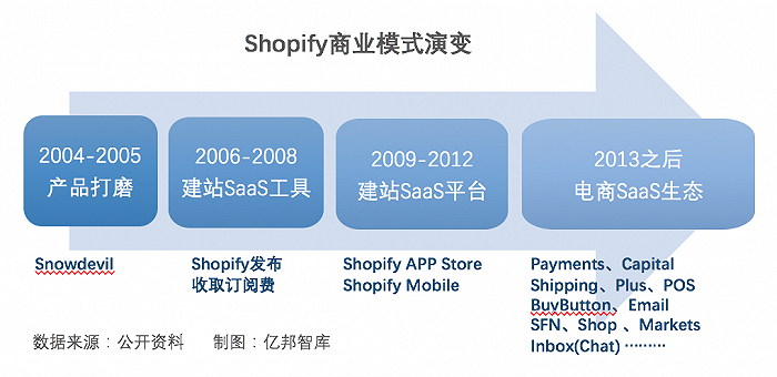 2009年,Shopify开放API上线应用商店,从单一建站工具升级为建站SaaS平台。软件开发者通过向Shopify平台中小商家提供个性化建店模板收费,作为平台方,Shopify从中收取一定比例佣金。