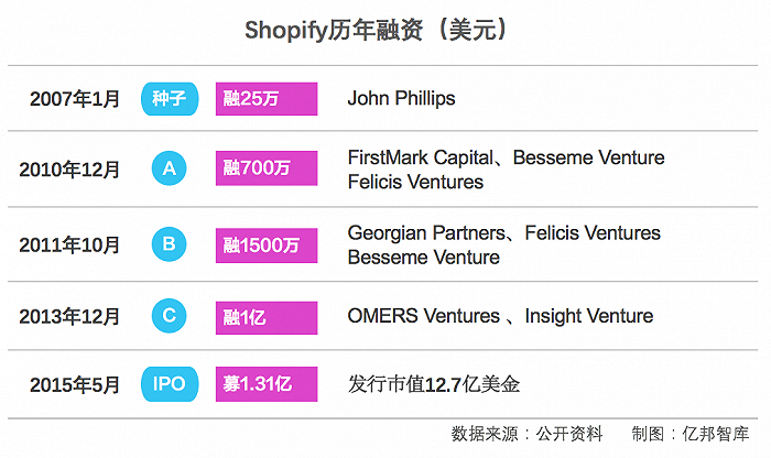 亮眼的业务增长,让Shopify先后拿到柏尚投资(Besseme)、Georgian Partners等机构两轮总计2200元美元投资。资本加持下,围绕中小商户建站需求和开店的支付、物流、营销需求,Shopify开始扩大服务产品,并于2014年营收突破1亿美元大关。
