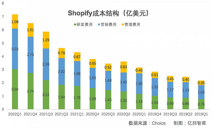 与此同时,Shopify2022年一季度净利润大幅亏损14.74亿美元,主要由于营收下降,但研发费用、营销费用和管理费用惯性增长,导致净利润变差。