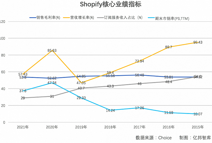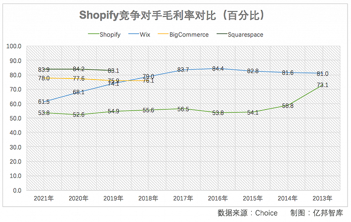 Shopify毛利数据表现不及竞争对手,与其订阅收入占比低,商家服务收入占比高直接相关。商家服务与GMV相关,带来超额收入的同时,拉低了毛利率。