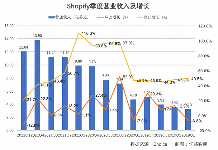 2022年一季度Shopify实现营收12亿美元,环比下降12.78%;同比增长22%,增速较疫情前下降超一半。疫情前,2019年连续四个季度,Shopify营收增速均在40%以上。事实上,从2021年四季度开始,Shopify的营收同比增速就开始低于疫情前,疫情带来的业绩提前透支影响开始显现。
