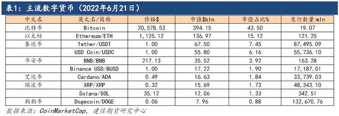 相对于贵金属与法定货币,私人数字货币具有创设成本低、发行成本高、交易成本低、价格波动性大、去中心化匿名性、无法被扣押冻结等特点。由于私人数字货币的创设基本上不受限制,而私人数字货币的创设上市会给创设人带来不菲的收入(也与数字货币规模的扩大和价格的变动有关),因此全球私人数字货币的数量一直快速增长,根据CoinMarketCap网站统计,截止2022年6月21日上午十点,全球私人数字货币有19940种,为全球法定货币种类的十五倍左右,供数字货币进行线上交易的交易所约9000个;全球数字货币总市值达到0.9万亿美元,但不同数字货币之间市值大小有天壤之别。其中标杆货币比特币一枝独大,市值占比达到43.5%,基本上占到全球数字货币总市值的半壁江山;以太坊、泰达币和USDC市值占比分别为15.12%、7.45%和6.16%,前十大数字货币合计市值达到83.82%。但与2021年1月26日(笔者上一篇数字货币专题报告撰写日期)比较,前十大数字货币合计市值占比从87.66%小幅下降至83.82%,前三大数字货币虽然还是比特币、以太坊和泰达币,但比特币和以太坊的市值占比已经分别从62.66%和16.08%分别下降至43.5%和15.12%,说明全球数字货币的集中性有明显下降,特别是比特币的重要性逐渐被以泰达币和USDC为代表的稳定币所取代。由于稳定币既具有价格稳定、保值性强的优点,又具有数字货币本身的交易费用低、去中心化匿名性等优点,我们预计这种趋势会继续发展下去。