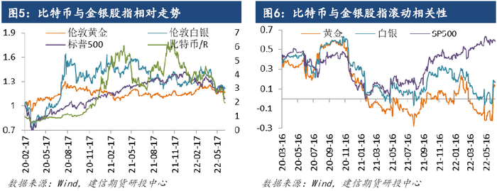 以CME比特币期货连续价格指代比特币价格,从2017年12月18日至2022年6月21日,比特币与伦敦黄金、伦敦白银和标普500指数的相关性分别为0.09、0.17和0.22,可见数字货币与贵金属或股指的相关性均非常低,但相对而言数字货币与风险资产的相关性更高一点;如果我们把考察时间限制到最近一轮价格波动周期,即2020年3月中旬至今,那么比特币与伦敦黄金、伦敦白银和标普500指数的相关性分别为0、0.16和0.4,数字货币的风险资产特征表现得更加明显。在相同的时间区间内,伦敦黄金、伦敦白银、标普500指数和比特币的年化波动率分别为14.2%、28.2%、21.6%和75.8%,可见数字货币的波动性非常高,除稳定币以外的其他数字货币基本上不具备保值功能。