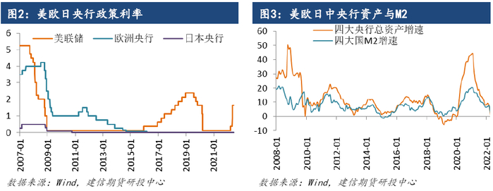 2020年2月份新冠疫情开始在全球快速扩散,美联储等全球央行实施超级宽松货币政策以缓解新冠疫情冲击,美联储在短短半个月之内将联邦基金利率目标区间由[1.5%,1.75%]下调至[0,0.25%],包括几乎所有的发达国家央行和多家新兴国家央行实施资产购买计划,结果是全球货币流动性极度泛滥。从2020年3月份到2021年11月份,美欧日中四大央行资产规模扩张幅度达到53%,同期四大经济体合计广义货币扩张幅度达到26%,扩张速度为2016年至2019年的2.5倍,也高于2008年金融危机后的货币扩张速度。另一方面,由于防范疫情所必须的社会隔离措施,社会生产正常秩序受到极大干扰,而政府部门以积极财政政策来维持居民部门现金流,因此货币流动性远超出实体部门所需,泛滥的货币流动性只能流入金融市场,肆意推高股票、大宗商品、房地产、数字货币等各类资产价格。2020年3月份至2021年11月,美国标普500指数、标普高盛商品价格指数、美国标普/CS房价指数和比特币价格分别上涨120%、130%、28.5%和1550%,短时间内货币流动性的大幅泛滥与社会生产受限成为各类金融资产价格同时上涨的主要原因。2020年3月份至8月份伦敦黄金上涨43%,虽然2020年8月至2021年7月黄金因全球经济复苏避险需求减退而偏弱调整,但调整幅度仅为19%,无论调整时间长度还是调整幅度都远小于上一轮(2011年8月份至2015年11月,45%),而且2021年8月份以来黄金因为通胀高企、乌克兰战争、金融市场波动和美国经济衰退预期而再次进入中期上涨趋势。