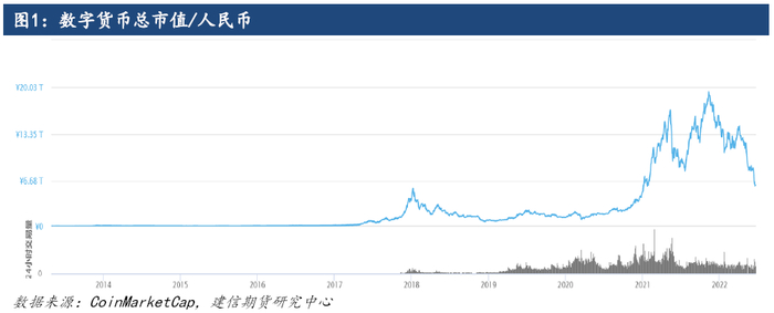 纵向来看,全球数字货币总市值在2017年4月份之前还处于近零水平,然后在2018年初上升到1万亿美元附近,得益于CME比特币期货上市对市场交易热情的带动;在经过2年多时间的震荡之后,从2020年3月份开始至2021年11月再次爆发至3万亿美元附近,随后一路下滑至目前的0.9万亿美元左右。以2021年底地表黄金存量18.72万吨计算,2017年4月1日、2020年8月7日和2022年6月21日三个时间点全球黄金市值分别为7.7万亿美元、12.2万亿美元和11.1万亿美元。