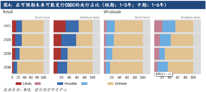 在对私人数字货币加强监管的同时,2019 年之后多国货币当局加快了央行数字货币的研发进程,试图在发扬数字货币在降低交易成本、便利货币流通等方面优点的同时限制数字货币在逃避监管、扰乱市场和便利非法交易方面的缺陷。国际清算银行BIS对2021年央行数字货币的调查报告《Gaining momentum-Results of the 2021 BIS survey on central bank digital currencies》显示,81家接受调查的国家或经济体(经济产出合占全球约94%)的中央银行中约90%已开展数字货币研究,正在进行实验或概念验证的央行比例从2020 年的60%增加到62%,包括巴哈马、中国、尼日利亚在内的约26%央行正在开发CBDC或进行试点,有2/3的央行考虑在可预见的未来发行CBDC的可能性;这些央行考虑发行CBDC主要是考虑到国内支付效率、支付安全和金融稳定性,而新兴市场国家央行更想籍此提高货币政策执行效率和跨境支付效率。另外,虽然目前私人数字货币包括稳定币的使用仅限于小众群体或特定使用情景,但相当一部分央行认为稳定币有可能成为一种广泛使用的支付方式,这与近期稳定币在私人数字货币中占比上升是相一致的;如果稳定币能在金融监管方面做得更加透明,相信稳定币能成为法币体系的有益补充,甚至直接被采纳为央行数字货币。