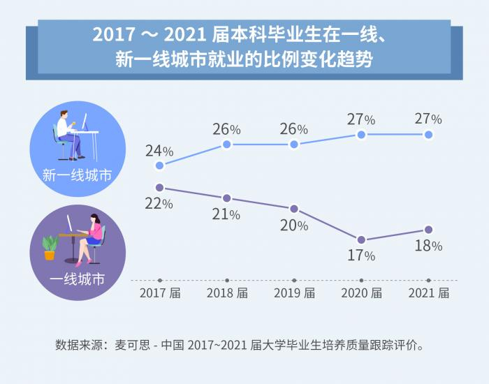 从近五年数据来看,应届本科生在新一线城市就业的比例稳步上升,2021届本科生在新一线城市就业的比例(27%)较2017届(24%)增加了3个百分点,而在一线城市就业的比例从2017届的22%减少至2021届的18%。