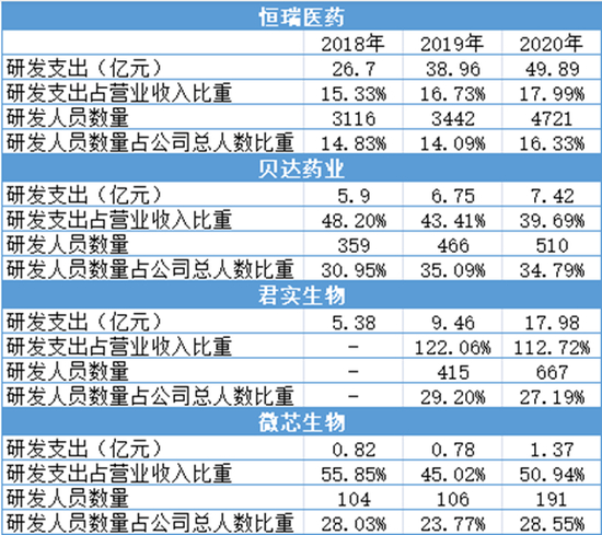 而对标国内头部创新药企恒瑞医药,2018年-2020年,恒瑞医药的研发支出占营业收入比重分别为15.33%、16.73%、17.99%,相较于贝达药业,这位A股龙头近年来的研发占比也只能算是“小巫见大巫”了。
