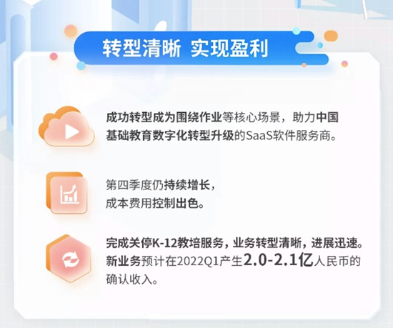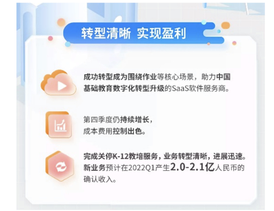 去年12月,一起教育科技宣布停止K12学科类培训业务,转型为围绕作业等核心教学应用场景的SaaS软件服务商,具体业务为教育信息化和面向家长的自学业务(即为家长在日常辅导孩子学习时,提供辅助)。