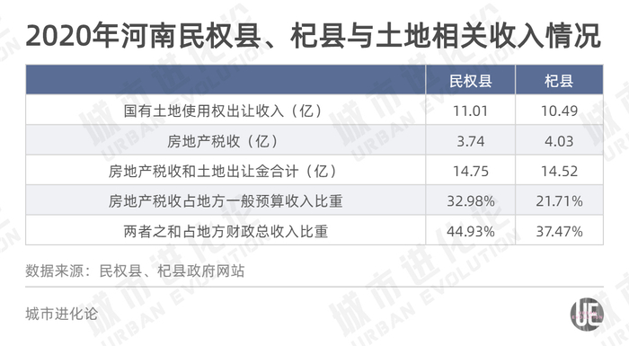 与土地相关收入占财政比例较高,助推了近年来一些地方对“土地财政”的依赖。城叔以民权县和杞县为例,对比两县2020年的财政数据。