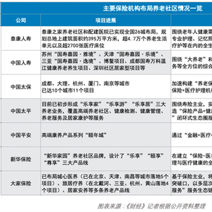 据市场分析显示,以轻重资产并进的模式布局养老社区、提供养老服务,越来越成为保险公司的共同选择,包括按照国家政策导向建设养老社区,通过轻资产形式拓展养老业务,建设普惠型养老社区,参与城企联动养老项目,建设民生福祉属性明显的养老社区,通过轻资产租赁形式建设的护理型、刚需型养老社区等,泰康保险、 中国人寿中国太平、中国太保、大家保险、中国平安等均为其中的代表。