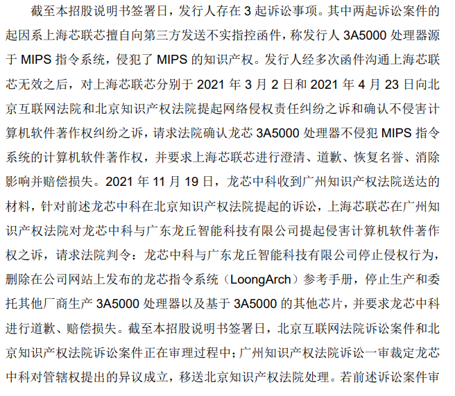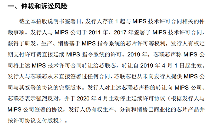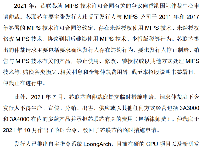 龙芯中科透露,截至本招股说明书签署日,该公司所应支付的明确可以或可能量化的金额预计不超过3200万元,其中包含已计提的版税、法律费用等,本次纠纷不会对该公司的财务方面产生重大不利影响。但是,如果仲裁结果不利于龙芯中科,该公司可能面临品牌和声誉遭受负面影响,在不利的仲裁结果得到境内执行后停止使用、提前停止出售基于MIPS指令系统的产品,进而可能对该公司的生产经营产生负面影响。