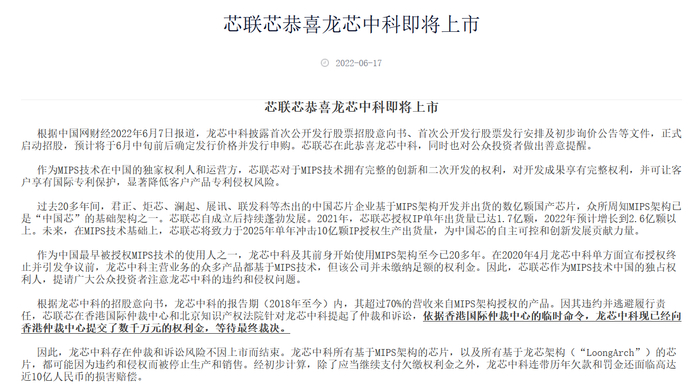 龙芯中科在招股书中也提示了相关风险。该公司表示,龙芯中科已推出自主指令系统LoongArch,目前在研的CPU项目以及新研发的CPU产品均基于LoongArch指令系统,以具有自主知识产权的核心技术为基础,未涉及MIPS指令系统,本次纠纷不会对龙芯中科技术方面产生重大不利影响。