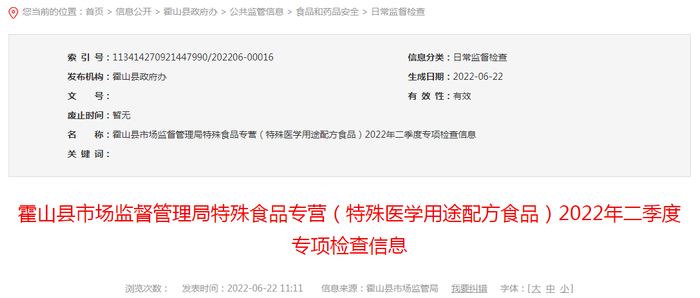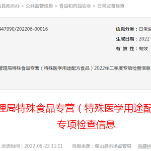 安徽省霍山县市场监管局特殊食品专营(特殊医学用途配方食品)2022年二季度专项检查信息