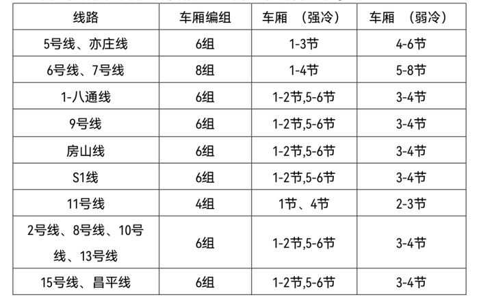 原标题:北京地铁全面启用“强冷弱冷车厢”模式,具体位置各线路分布不同