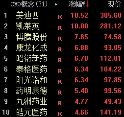 CXO概念板块震荡走高。凯莱英涨停,美迪西涨超10%,博腾股份、康龙化成、昭衍新药等大涨。