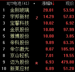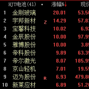 HJT电池板块早盘快速走高。金刚玻璃20cm涨停,金辰股份、雅博股份、宝馨科技封板,宇邦新材涨超14%。