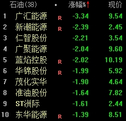 石油板块走低,广汇能源、新潮能源、仁智股份等跌幅居前。